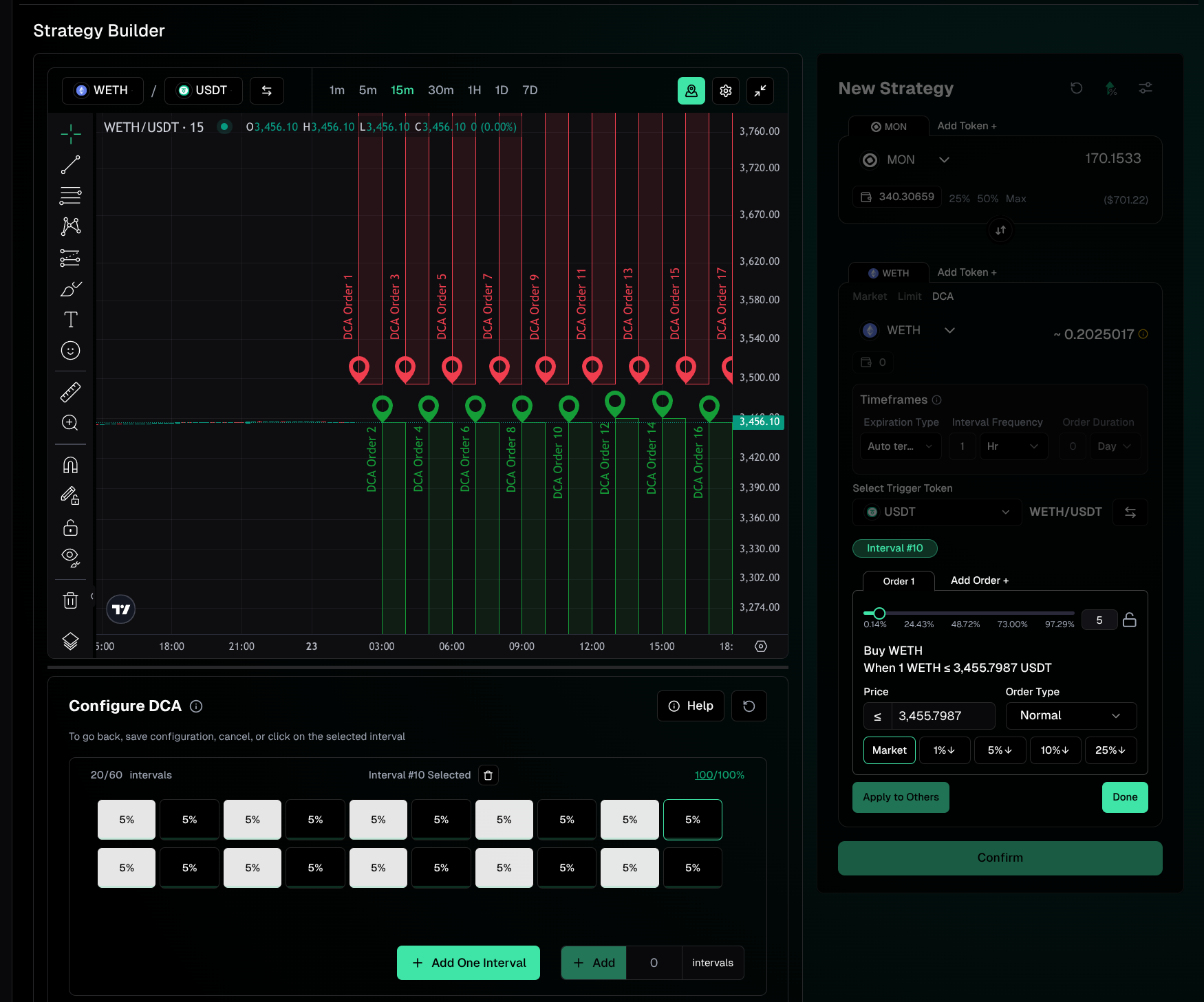 Strategy Lab is a no-code environment for designing, configuring, and executing on-chain strategies. Built for users who want more than simple trade execution, Strategy Lab provides an intuitive graphical interface where you can construct automated behaviors such as limit orders, multi-component DCA schedules, laddered accumulation plans, or downside-protection hedges. Every strategy is built from modular components, enabling you to combine timing logic, price conditions, asset movements, and multi-protocol interactions without touching smart-contract code or writing automation scripts.